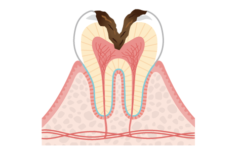 象牙質よりさらに内側にある神経にまで、虫歯が到達した状態です。冷たいものだけでなく、熱いものがしみるようになったり、なにもしていなくてもズキズキと痛む、といった自覚症状がでてきます。