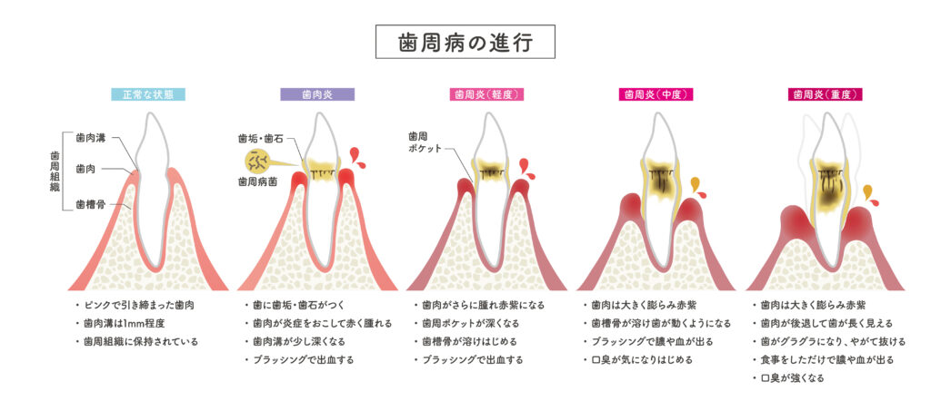 歯周病は年齢に伴って進行していき、痛み・自覚症状がない場合が多いです。悪化すると、歯が抜ける状態にもなりえます。 現在、歯周病は日本人が歯を失う原因の第1位ともされており、早期発見が非常に重要になってきます。